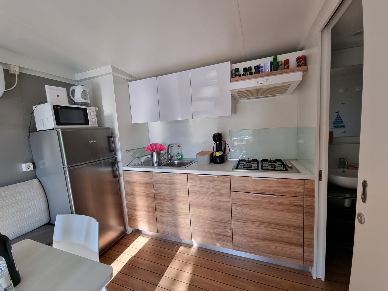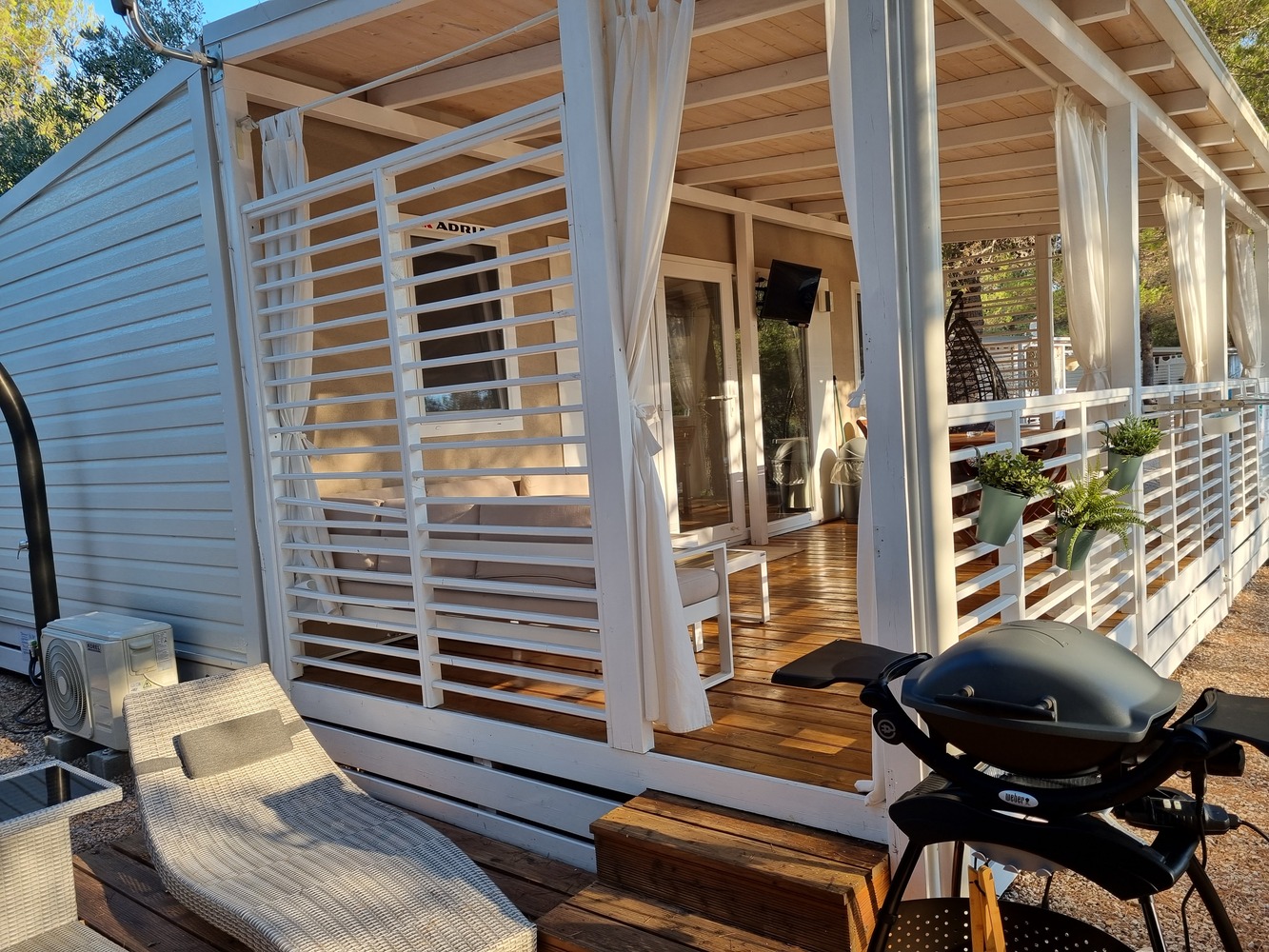 Mobilna kućica je okružena borovima koji pružaju ugodnu hladovinu veći dio dana. Nalazi se u najmirnijem dijelu kampa. Besplatan WiFi dostupan je u kućici i u užem području okolo nje. Uz kućicu se nalazi i besplatan parking za vaše vozilo. Najbliža plaža udaljena je svega nekoliko minuta hoda, uglavnom u hladu (300 metara).