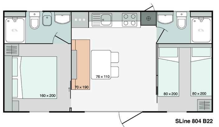 Unutar kućice se nalaze dvije spavaće sobe, jedna s većim bračnim krevetom (160 x 200 cm) i druga s dva odvojena kreveta (80 x 200 cm). Dnevni boravak ima kauč, LCD TV i stol sa stolicama te služi i kao blagovaonica. Kauč ​​na razvlačenje može se koristiti i kao pomoćni ležaj za 2 manje osobe.